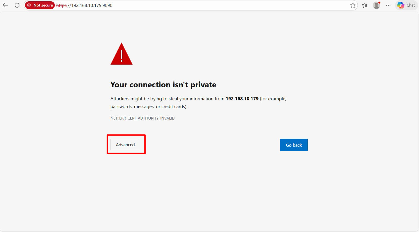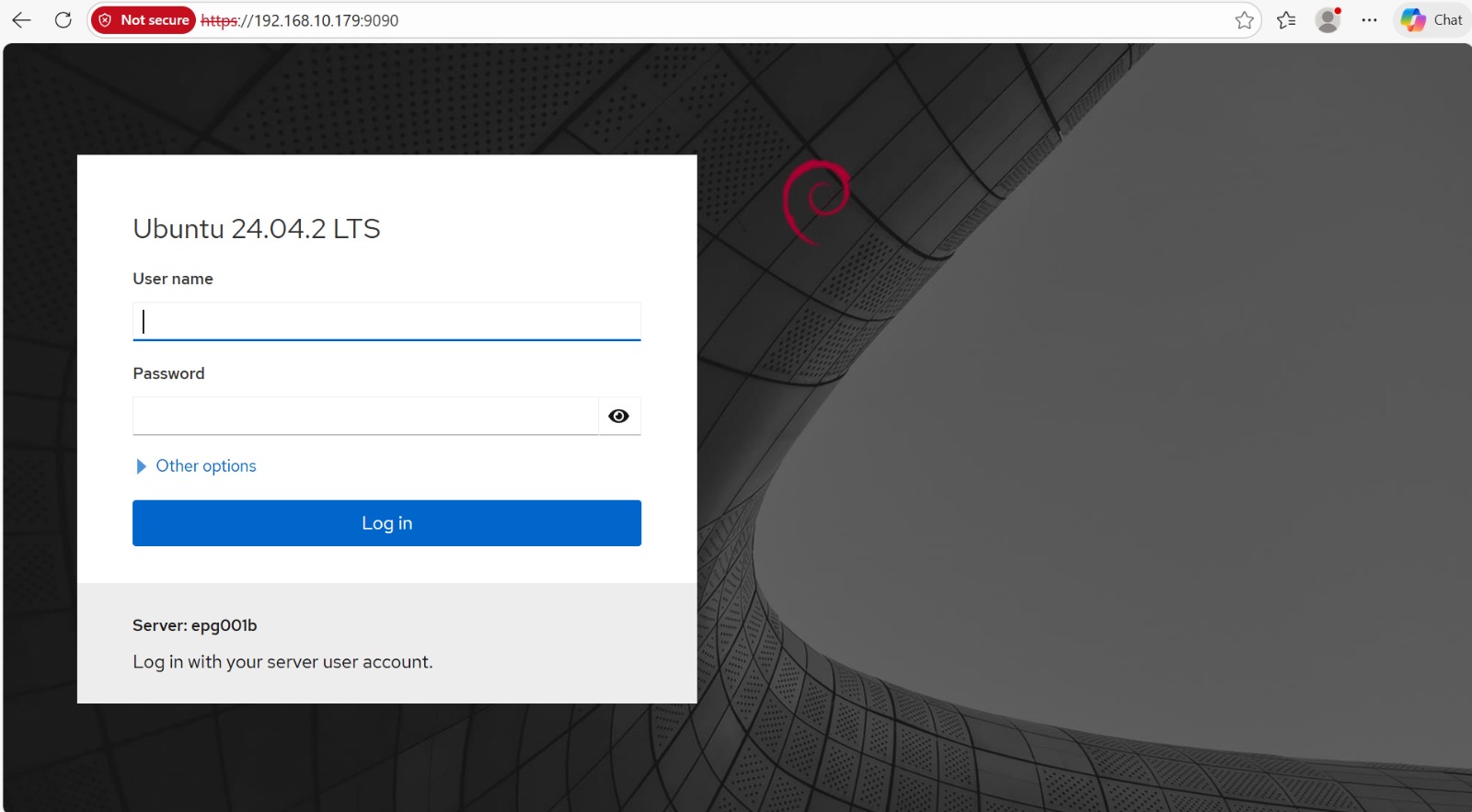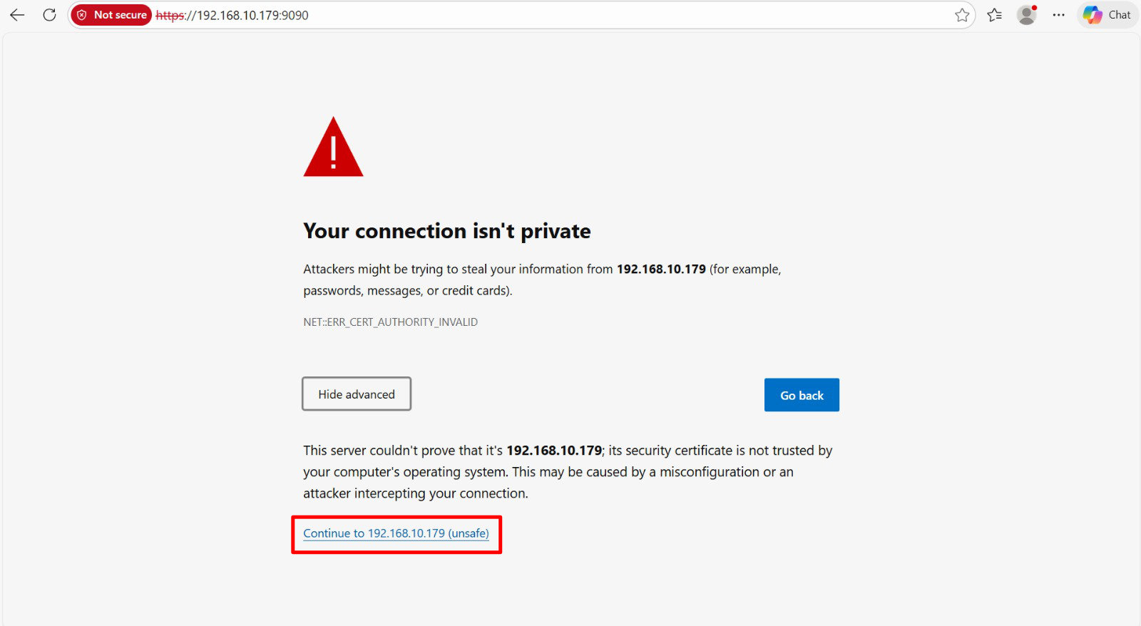 https://your_ipaddress:9090/Replace "your_ipaddress" with the actual IP address of the machine.