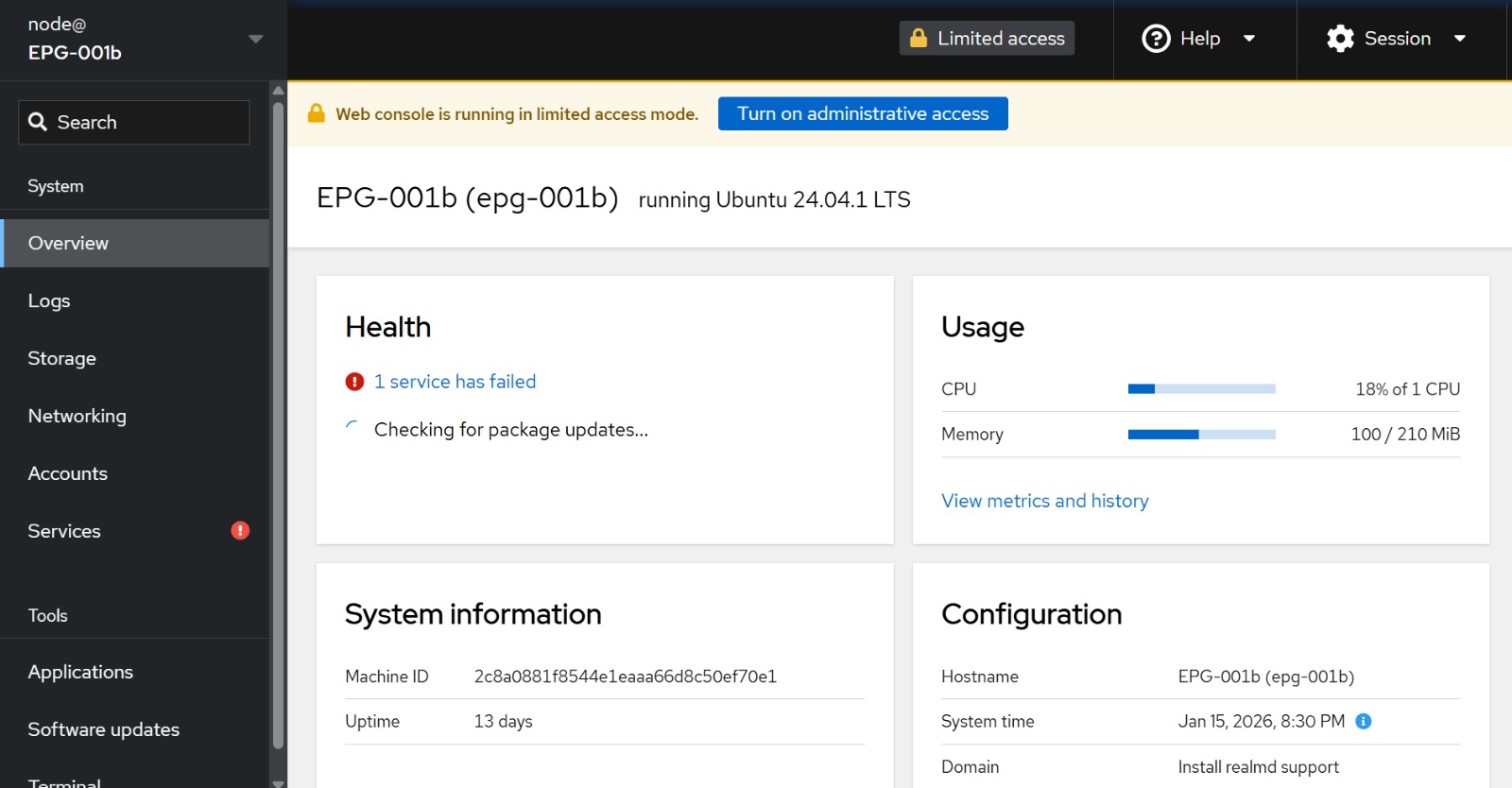 Enter the username and password in order to login to Cockpit. The default username is "node" and the default password is "NodeRed". Note that the password is CaSe SeNsItIvE